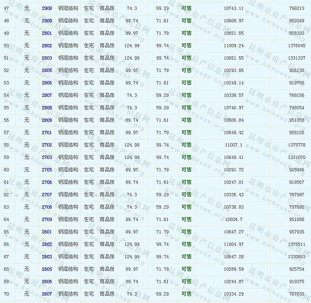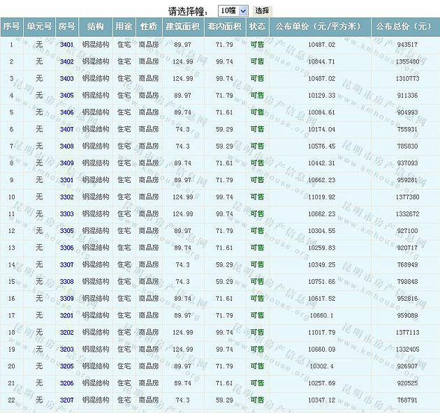 根據(jù)云南省物價局關(guān)于發(fā)布《云南省商品房銷售明碼標(biāo)價實施細(xì)則(試行)》的通知,現(xiàn)將該項目商品住房的準(zhǔn)售房源及每套房屋價格向社會公布,房地產(chǎn)開發(fā)企業(yè)應(yīng)嚴(yán)格按照公布價格,商品房銷售明碼標(biāo)價實行一套一標(biāo)。商品房經(jīng)營者應(yīng)當(dāng)對每套商品房按照建筑面具進(jìn)行明碼標(biāo)價,否則,房產(chǎn)登記機(jī)關(guān)不予登記備案。準(zhǔn)售房源及房價信息如下: