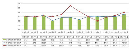 圖3-1:2011年12月-2012年11月昆明商業(yè)價(jià)格指數(shù)走勢(shì)圖(數(shù)據(jù)來源:至祥研究中心)