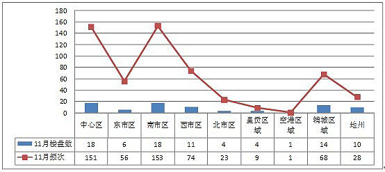 分板塊來(lái)看,二環(huán)內(nèi)板塊和東南板塊的項(xiàng)目11月份投放較為集中,廣告投放頻次較多,報(bào)媒投放頻次分別為131次和86次。其中二環(huán)內(nèi)板塊以同德•昆明廣場(chǎng)項(xiàng)目的投放頻次最多,共投放50次,占二環(huán)內(nèi)板塊投放整體比例的38%。東南板塊主要以中豪•悅城/逸境和新亞洲歡樂(lè)城項(xiàng)目的投放頻次為主,分別投放31次和29次,分別占東南板塊投放整體比例的36%和34%。此外世博板塊的南亞未來(lái)城和西山板塊的馬街摩爾成項(xiàng)目本期投放次數(shù)也較高,分別投放41次和32次。