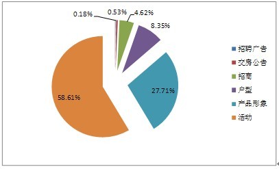 廣告訴求方面,11月份主要以項目的活動類廣告(包括開盤、認籌、促銷、開業(yè)、優(yōu)惠等房地產(chǎn)項目活動)居多,占到整體廣告比例的58.61%,其次是產(chǎn)品形象類廣告,占整體廣告比例的27.71%,其它類型的廣告占比較小。其中戶型類廣告占整體比例的8.35%,招商類廣告占整體比例的4.62%,交房公告類廣告和招聘類廣告占比最小,僅占整體比例的0.53%和0.18%。