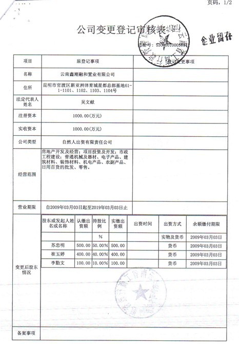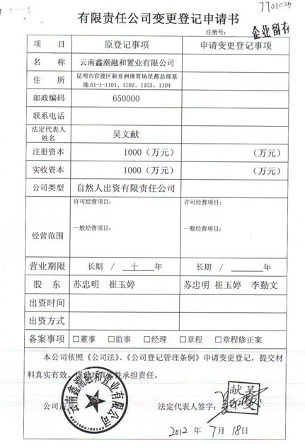 據(jù)崔玉婷助手李波出具的一份“公司變更登記審核表”。審核表顯示的登記日期是2009年3月3日,由蘇忠明出資500萬元,持有云南鑫潮融合置業(yè)有限公司50%股份,另外崔玉婷出資400萬元,持有公司40%股份,還有一個叫李勤文的股東出資100萬元,持有公司10%的股份。同時李波還出具了一份“有限責任公司變更登記申請書”在2012年7月18日時,落有云南鑫潮融合置業(yè)有限公司印章的一份“有限責任公司變更登記申請書”上記錄,公司法人代表為吳文獻,申請變更登記事項股東一欄載明,股東蘇忠明、崔玉婷、李勤文。原登記事項股東一欄只有蘇忠明和崔玉婷的名字,李勤文的名字已經(jīng)不在股東姓名一欄。至于申請變更最后是否獲最終確認,就不得而知。