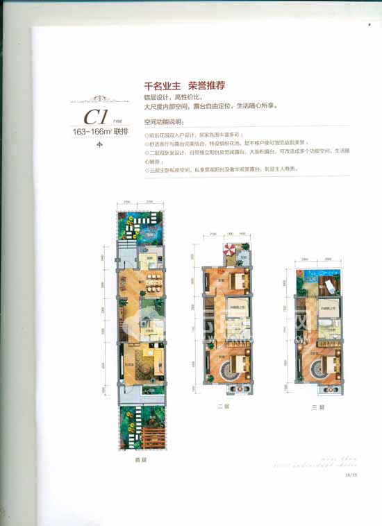 聯(lián)排C1戶型,面積163—166平米,主要分布在C74棟、C76棟以及C79—C84棟,這種戶型共有三層。