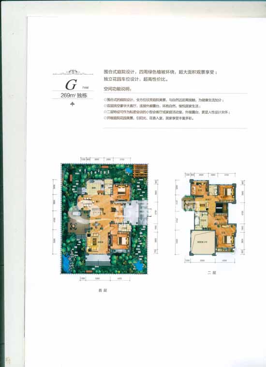 獨(dú)棟G戶型,面積269平米,主要分布在B8—B26棟,這個(gè)戶型共有兩層。該戶型的特點(diǎn)是:采用了圍合式的庭院設(shè)計(jì),四周被綠色的植被所環(huán)繞,業(yè)主可以全方位地欣賞庭院美景;客廳采用了雙層挑高設(shè)計(jì);再加上獨(dú)立的花園車位設(shè)計(jì),性價(jià)比較高。