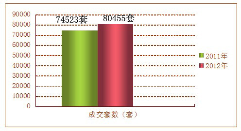 根據(jù)昆明市房產(chǎn)信息網(wǎng)統(tǒng)計數(shù)據(jù)顯示,從2012年01月01日至2012年12月31日,一年內(nèi)昆明主城區(qū)及呈貢新城共成交各類商品房80455套,較2011年的74523套增加了5932套,同比上漲了8.0%;成交面積方面,2012年昆明樓市成交商品房總面積為6939931.5㎡,較2011年的6055703.4㎡增加了884228.1㎡,同比上漲了14.6%。