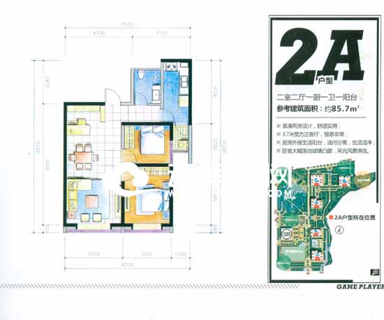 兩室兩廳一廚一衛(wèi)一陽臺的2A戶型