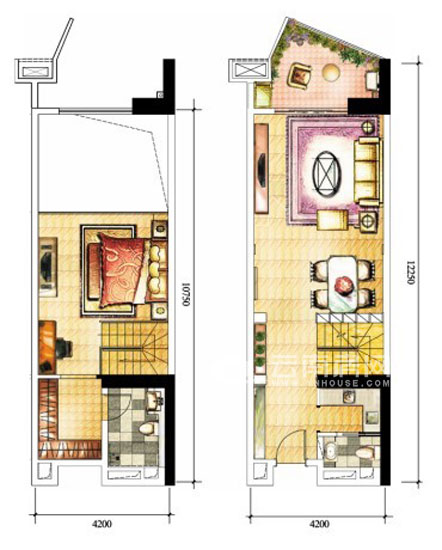 其中B戶型為躍層房源,被命名為領寓,單層戶型面積從58-67平米。為一室兩廳一廚兩衛(wèi)一陽臺設計。戶型結構簡潔,方正,躍層第二層空間,原客廳部分空間可選擇搭臺,增加利用空間,也可以留出來,為客廳挑高保留空間。但此戶型或只作為毛坯房出售,因客戶要求不同。故躍層房源在裝修時成本將過高,需考慮搭臺和樓梯的費用在內。