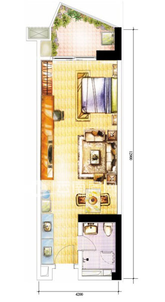 C1戶型被命名為格調(diào),為一室兩廳一衛(wèi)戶型,建筑面積59-64平米。此戶型就是一個(gè)簡(jiǎn)單的長(zhǎng)方形大開(kāi)間加一個(gè)不規(guī)則的陽(yáng)臺(tái)設(shè)計(jì)。房屋格局簡(jiǎn)單,但功能齊備。但此戶型內(nèi)部空間沒(méi)有多余的隔間,較適合單身貴族居住。