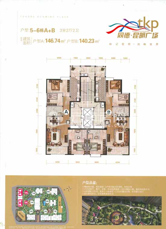 146.74平米的A戶型和140.23平米的B戶型是三室兩廳一廚兩衛(wèi)的格局,這兩種戶型主要分布在中央A區(qū)的5棟和6棟上。這兩種戶型格局相同,朝向相反,兩梯兩戶的配置,電梯需要打卡進(jìn)入,且只在業(yè)主自家的入戶門口?俊k娞萃饷媾c入戶門之間的面積完全贈送,業(yè)主可以根據(jù)自己的喜好打造成自家的私享空間。