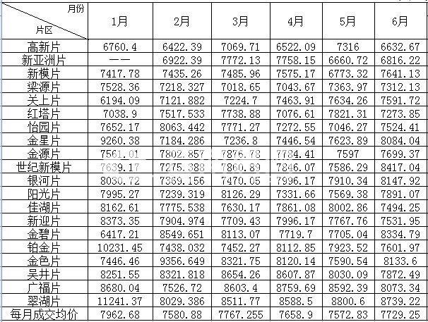 2012二手住房上半年各片均價統(tǒng)計表