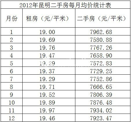 2012年昆明二手房年報:二手住宅成交均價7769元/平 租房均價19元/平