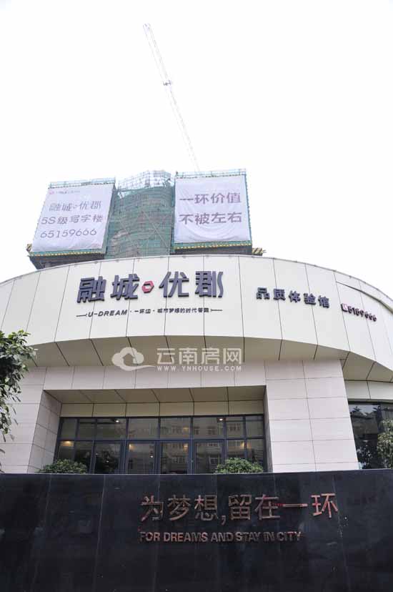 在嚴(yán)家地下車之后往西園路的方向步行100多米之后便可看見(jiàn)融城優(yōu)郡的廣告圍欄,廣告黑白相間,白色背景墻上寫有黑色的“只有這里才是我想要的生活”,“只有這里,才有我想要的萬(wàn)千繁華”等字樣,廣告語(yǔ)中沒(méi)有多少華麗辭藻的包裹,也沒(méi)有很深的文學(xué)意蘊(yùn),簡(jiǎn)單但是又能在人們心中攪起幾絲波瀾。廣告圍欄一直往售樓部所在的位置延伸,廣告圍欄的盡頭便是項(xiàng)目售樓部。融城優(yōu)郡似乎挺鐘愛(ài)黑色的,售樓部的前方是個(gè)齊腰黑色背景的牌坊,黑色的背景上寫著“為夢(mèng)想,留在一環(huán)的”的字樣,售樓部后面是兩棟正在施工的建筑,還穿著綠色的衣裳。