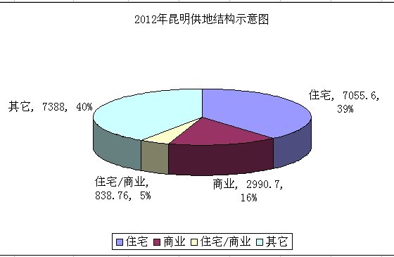 2012年,昆明住宅用地供應(yīng)共106宗,7055.6畝,占總供地量的39%;商業(yè)用地87宗,2990.7畝,占總供地量的16%;住宅與商業(yè)混合用地共12宗,836.76畝,占5%。其它用地,包括科教用地、文體娛樂用地、醫(yī)衛(wèi)慈善用地、街巷用地、工業(yè)用地等等,共7388畝,占40%。