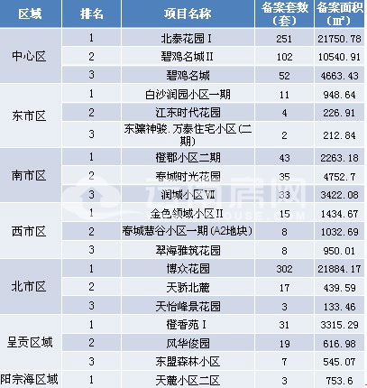 本周備案前三強(qiáng)分別位于北市區(qū)與中心區(qū),排名先后順序?yàn)椋翰┍娀▓@、北泰花園I和碧雞名城II。注:由于備案系統(tǒng)未公布成交金額,故備案金額暫時(shí)空白。