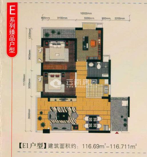 E1戶型,建筑面積約116.69-116.711平米,為三室兩廳一廚一衛(wèi)設(shè)計(jì)。此戶型朝向?yàn)槲鞅背,該戶型的亮點(diǎn)在于入戶空間面積達(dá)8.58平米,日后可用作會(huì)客廳使用;三間臥室均帶有飄窗,主臥緊鄰一個(gè)寬約3.9米的陽(yáng)臺(tái),怎強(qiáng)臥室采光;此戶型動(dòng)靜分區(qū)明確,但過道空間偏長(zhǎng),面積稍顯浪費(fèi)。