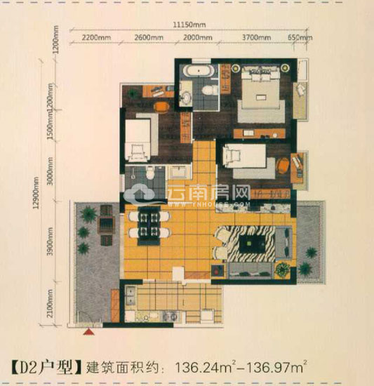 D2戶型,建筑面積約136.24-136.97平米,為三室兩廳一廚兩衛(wèi)設(shè)計(jì)。此戶型為東北朝向,入戶空間面積達(dá)13.2平米,可作為入戶花廳打造;主臥自帶獨(dú)立衛(wèi)生間,保證私密性;客廳與大面積陽臺(tái)相連,通風(fēng)采光較好;開放式廚房可能會(huì)造成室內(nèi)油煙味過重。