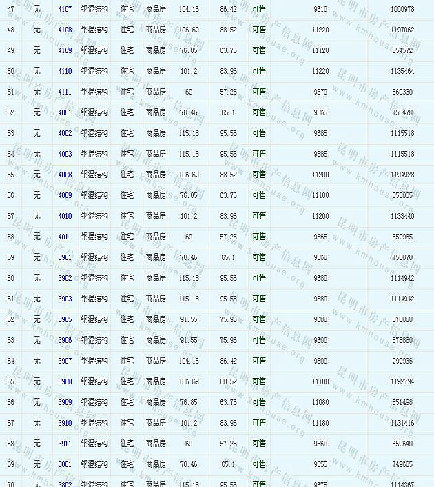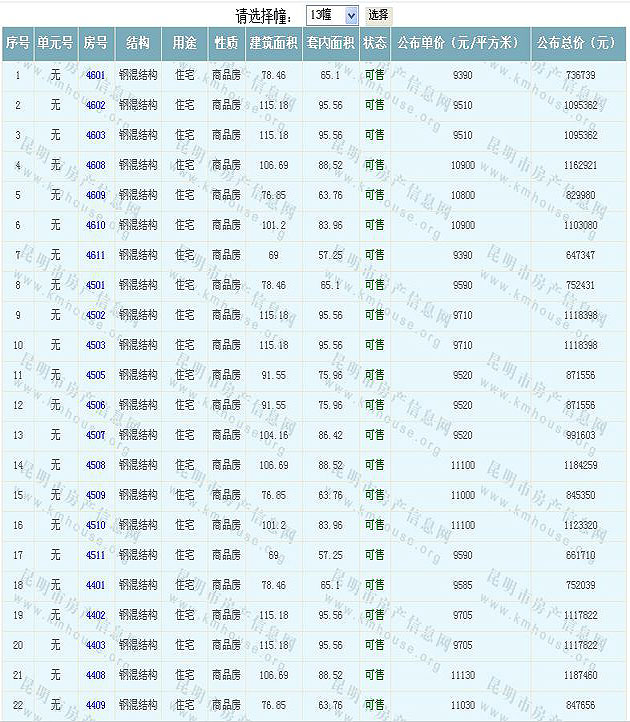 根據(jù)云南省物價(jià)局關(guān)于發(fā)布《云南省商品房銷售明碼標(biāo)價(jià)實(shí)施細(xì)則(試行)》的通知,現(xiàn)將該項(xiàng)目商品住房的準(zhǔn)售房源及每套房屋價(jià)格向社會(huì)公布,房地產(chǎn)開發(fā)企業(yè)應(yīng)嚴(yán)格按照公布價(jià)格,商品房銷售明碼標(biāo)價(jià)實(shí)行一套一標(biāo)。商品房經(jīng)營(yíng)者應(yīng)當(dāng)對(duì)每套商品房按照建筑面具進(jìn)行明碼標(biāo)價(jià),否則,房產(chǎn)登記機(jī)關(guān)不予登記備案。準(zhǔn)售房源及房?jī)r(jià)信息如下:
