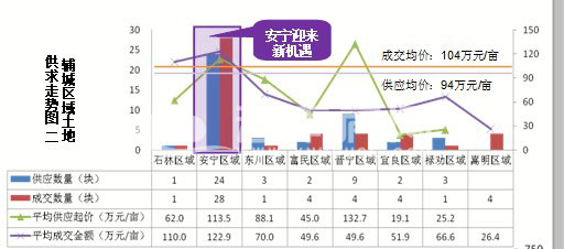 輔城供求主要集中在安寧區(qū)域,晉寧區(qū)域成交均價(jià)最高,整體成交均價(jià)104萬元/畝。