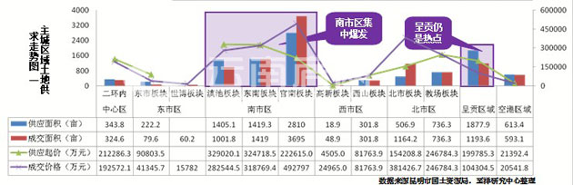 1月份昆明土地供求旺盛,供求單價分別為166萬元/畝和188萬元/畝;