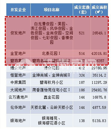 俊發(fā)憑借旗下多個項目連續(xù)兩月成為月度銷售最多企業(yè),成交排名靠前的企業(yè)還有金呈地產(chǎn)與碧雞集團。