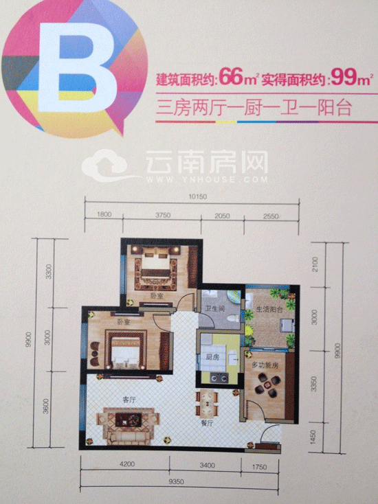 66平米的B戶型(樣板房戶型),三室兩廳一廚一衛(wèi)一陽(yáng)臺(tái),贈(zèng)送面積約33平米,實(shí)得面積約99平米。該戶型最大的特點(diǎn)為約6平米的多功能房及5.25平米的超大生活陽(yáng)臺(tái),在滿足一家三口舒適居住的同時(shí),該空間作為書房或娛樂休閑空間為生活增添了很多情趣。