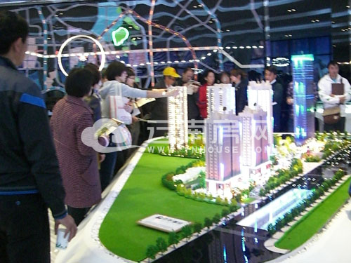 購房者們圍著沙盤咨詢置業(yè)顧問
