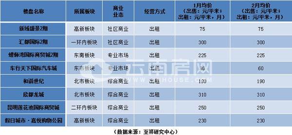 從1、2月商業(yè)銷售均價變化情況來看,鑫益財富北街、銀海尚御、匯都國際、昆明玉器城等項目商鋪銷售價格上漲幅度較快,市場價格漲幅總體平穩(wěn)上漲。
