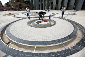 圖為新工人文化宮職工廣場(chǎng)上,工作人員正加緊施工。