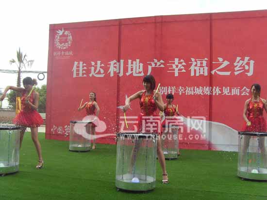 還未走近項(xiàng)目現(xiàn)場(chǎng)就能聽見悠揚(yáng)的樂隊(duì)合奏。進(jìn)入活動(dòng)現(xiàn)場(chǎng),眼前隨之一亮,與其說是媒體見面會(huì),不如說是一場(chǎng)精致的露天冷餐會(huì)來得恰當(dāng)。現(xiàn)場(chǎng),佳達(dá)利地產(chǎn)為到訪的嘉賓們悉心準(zhǔn)備了各式可口的水果和糕點(diǎn)。最為特別的還是舞臺(tái)的布置,相較大部分開發(fā)商都在舞臺(tái)上鋪上紅地毯,佳達(dá)利地產(chǎn)可謂獨(dú)樹一幟,整個(gè)舞臺(tái)背景以紅色調(diào)為主,背景板上寫著佳達(dá)利地產(chǎn)幸福之約,一襲白衣的天使朝著幸福飛去,而舞臺(tái)的地面卻是碧綠的草地,紅綠相間在陽光的映襯下顯得更加奪目。