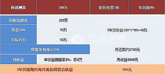 按項(xiàng)目給出的每年給予8%的回報(bào)率,逐月返還的投資政策,以一套總價(jià)值100萬元的商鋪計(jì)算,則首付50萬元,需貸款50萬元,目前銀行貸款5年期以下年利率為6.55%,月還款額就約為5700元。而潤城商鋪每年有8%的回報(bào)率,100萬元的商鋪,委托經(jīng)營5年就有40萬元的回報(bào),共計(jì)有60個(gè)月,按月返利,則每月的收益為6666元,5年回報(bào)期內(nèi)每月抵扣貸款后收益為6666元-5700元=966元,5年除還銀行貸款之外,5年共計(jì)還可以獲得57960元的收益。