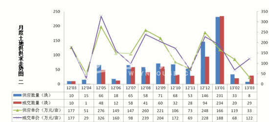 3月土地供應(yīng)較2月減少,但是成交較2月相比有所增加;供應(yīng)均價(jià)方面較上月下降,但是成交均價(jià)較上月增長(zhǎng)明顯。