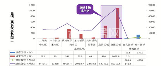3月土地成交則集中在主城區(qū)域,滇池板塊是老城區(qū)的土地成交量高點(diǎn),而空港區(qū)以1098.6畝,80319.4萬(wàn)元的數(shù)據(jù)引領(lǐng)昆明土地成交市場(chǎng)。