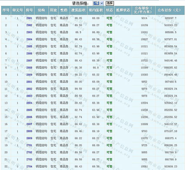 根據(jù)云南省物價局關于發(fā)布《云南省商品房銷售明碼標價實施細則(試行)》的通知,現(xiàn)將該項目商品住房的準售房源及每套房屋價格向社會公布,房地產(chǎn)開發(fā)企業(yè)應嚴格按照公布價格,商品房銷售明碼標價實行一套一標。商品房經(jīng)營者應當對每套商品房按照建筑面具進行明碼標價,否則,房產(chǎn)登記機關不予登記備案。準售房源及房價信息如下: