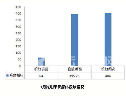 放量猛增:從昆明房地產(chǎn)廣告整體投放情況來看,3月投放量較1、2月投放強(qiáng)度明顯增強(qiáng),3月投放項(xiàng)目較2月多44個(gè),投放版面多345.25版,投放頻次多349次。