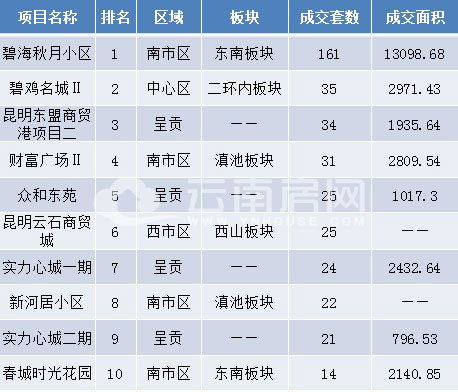 第17周房地產(chǎn)市場(chǎng)交易套數(shù)三強(qiáng):本周備案前三強(qiáng)分別位于南市區(qū)、中心區(qū)與呈貢,排名先后順序?yàn)椋罕毯G镌滦^(qū)、碧雞名城II和昆明東盟商貿(mào)港項(xiàng)目二。