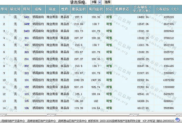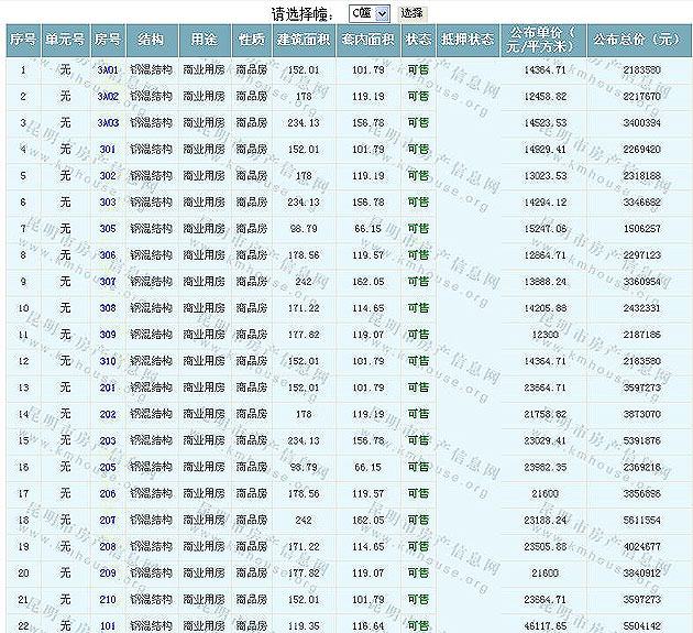 根據(jù)云南省物價(jià)局關(guān)于發(fā)布《云南省商品房銷售明碼標(biāo)價(jià)實(shí)施細(xì)則(試行)》的通知,現(xiàn)將該項(xiàng)目商品住房的準(zhǔn)售房源及每套房屋價(jià)格向社會(huì)公布,房地產(chǎn)開發(fā)企業(yè)應(yīng)嚴(yán)格按照公布價(jià)格,商品房銷售明碼標(biāo)價(jià)實(shí)行一套一標(biāo)。商品房經(jīng)營(yíng)者應(yīng)當(dāng)對(duì)每套商品房按照建筑面具進(jìn)行明碼標(biāo)價(jià),否則,房產(chǎn)登記機(jī)關(guān)不予登記備案。準(zhǔn)售房源及房?jī)r(jià)信息如下: