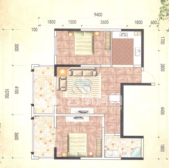 F戶型,建筑面積91.29平米,為兩室兩廳一廚一衛(wèi)雙陽(yáng)臺(tái)設(shè)計(jì)。