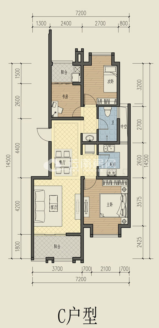 C戶型為三房兩廳一廚一衛(wèi)雙陽臺設(shè)計,建筑面積93.19平米,套內(nèi)面積75.04平米,戶型布局錯落有致且布局緊湊,適合三口之家居住,該戶型最大的亮點在于設(shè)有書房,且書房與小陽臺相連,看書時可與河畔美景隨時相伴,豈不妙哉!次臥與書房緊鄰,與主臥南北分立,可方便孩子看書學(xué)習(xí)且有足夠的私密空間。餐廳與客廳相連外接大陽臺,空間明亮寬闊。