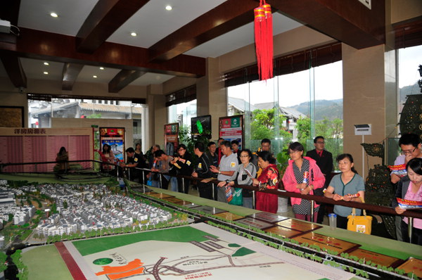 在玉器城售樓部,看房團(tuán)B線與A線在這里匯合,浩浩蕩蕩120多人擠滿了售樓部。據(jù)介紹,昆明玉器城背靠翡翠山,整個(gè)項(xiàng)目地勢(shì)東高西低,依山而建。項(xiàng)目將打造成以珠寶玉石展示銷售為中心,集傳統(tǒng)文化、民間文化、翡翠拍賣、加工、批發(fā)、零售、科研、博覽、人才培養(yǎng)、民族風(fēng)情餐飲、民族商品展銷,以及旅游休閑、健康購(gòu)物、膳食養(yǎng)生、高尚住宅、文化娛樂(lè)等多種功能于一體的珠寶展銷平臺(tái)和珠寶品牌展示平臺(tái)。目前,楊麗萍“云南映象村”、美國(guó)精選國(guó)際酒店集團(tuán)凱瑞華晟國(guó)際度假村已經(jīng)簽約入駐昆明玉器城!霸颇嫌诚蟠濉苯ǔ芍螅瑢⒊蔀闂铥惼肌对颇嫌诚蟆吩诶ノㄒ恢付ㄑ莩鳇c(diǎn)。