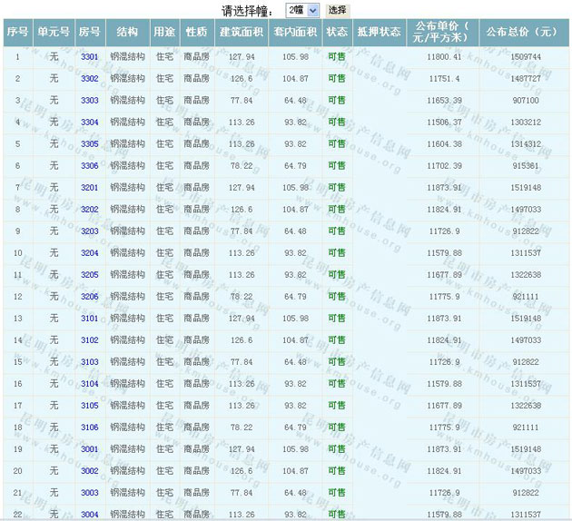 根據(jù)云南省物價(jià)局關(guān)于發(fā)布《云南省商品房銷售明碼標(biāo)價(jià)實(shí)施細(xì)則(試行)》的通知,現(xiàn)將該項(xiàng)目商品住房的準(zhǔn)售房源及每套房屋價(jià)格向社會(huì)公布,房地產(chǎn)開發(fā)企業(yè)應(yīng)嚴(yán)格按照公布價(jià)格,商品房銷售明碼標(biāo)價(jià)實(shí)行一套一標(biāo)。商品房經(jīng)營(yíng)者應(yīng)當(dāng)對(duì)每套商品房按照建筑面具進(jìn)行明碼標(biāo)價(jià),否則,房產(chǎn)登記機(jī)關(guān)不予登記備案。準(zhǔn)售房源及房?jī)r(jià)信息如下: