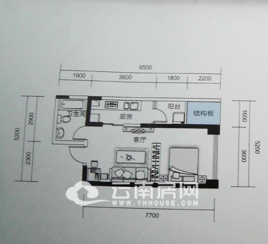 進入門廳之后便是客廳連接臥室的大通間,整個空間透過臥室大面寬窗戶采光,衛(wèi)生間安排與廚房一字型排開,干濕分離。廚房借用陽臺光線,通風和采光都得到解決。整個戶型布局緊湊,利用率高。戶型缺憾是,房屋采光面少,灰色空間的存在在某些方面影響到生活便利。