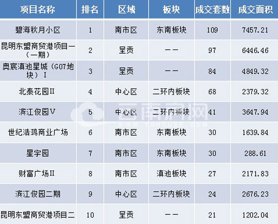 本周備案前三強(qiáng)分別位于南市區(qū)與呈貢,排名先后順序?yàn)椋罕毯G镌滦^(qū)、昆明東盟商貿(mào)港項(xiàng)目一(一期)與奧宸滇池星城(G07地塊)I。注:由于備案系統(tǒng)公布數(shù)據(jù)局限,top10排名僅做參考。