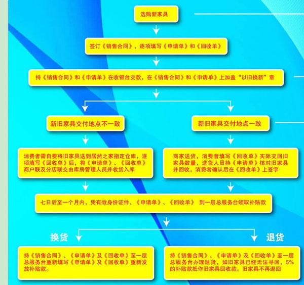據(jù)了解,居然之家2013年3月9日起在昆明推出家具“以舊換新”活動(dòng)。以舊換新“的意思是指,消費(fèi)者在購(gòu)買新家具的同時(shí),可以申請(qǐng)將舊家具交居然之家收回,居然之家按消費(fèi)者新購(gòu)家具交款金額的5%給予現(xiàn)金補(bǔ)貼,單件家具補(bǔ)貼金額不超過(guò)600元。同一類新舊家具數(shù)量原則上不能超過(guò)1:1,即同一品類回收家具數(shù)量不得少于新購(gòu)買家具的數(shù)量,只要求數(shù)量上的對(duì)應(yīng),不嚴(yán)格區(qū)分新舊家具的規(guī)格、大小和材質(zhì)。由于櫥柜、衣柜等不可移動(dòng)家具參加“以舊換新“活動(dòng)較為復(fù)雜,因此,“以舊換新“活動(dòng)只限可移動(dòng)家具。居然之家對(duì)具體操作流程也進(jìn)行了詳細(xì)的圖解: