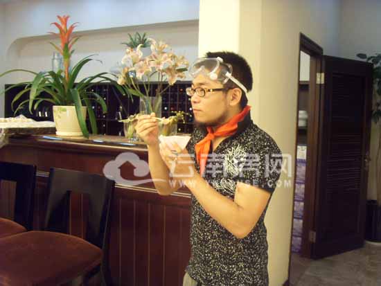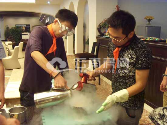直到10分鐘后,工作人員才將成品呈現(xiàn)在大家面前——一大盒的香蕉冰淇淋,小編恍然大悟,原來今天這煙霧繚繞的活動便是DIY冰淇淋大賽?吹匠善,小編也躍躍欲試,在現(xiàn)場工作人員的指導(dǎo)下,小編做了一份巧克力冰淇淋。其實原料都很簡單,現(xiàn)成的巧克力基底液、奧利奧餅干一塊、普通純牛奶。首先把三種原料混合攪拌均勻,看著一大罐粘稠的液體,絲毫看不出冰淇淋的跡象。接下來,最重要的原料就要登場了——液態(tài)氮,一名工作人員將液態(tài)氮倒入剛剛的混合液中,另一名工作人員還要負(fù)責(zé)扶著裝混合液的容器,小編就只負(fù)責(zé)打開攪拌器拼命地攪拌,頓時煙霧四溢,很有舞臺效果。