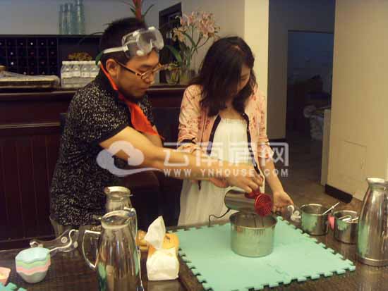 云南房網(wǎng)到達(dá)奧宸財富廣場售樓部時并不知是什么活動,只見活動現(xiàn)場煙霧繚繞,靠近煙霧之后隱隱傳來絲絲涼意,還能聽見攪拌器嗡嗡的工作聲。走近一看,最吸引人眼球的是桌面上的幾個壺,壺嘴里不斷地冒出白煙,不少業(yè)主都在尋思著那是何物,有人猜測是開水,現(xiàn)場工作人員笑而不答。