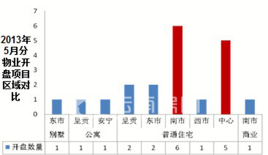 分區(qū)域:5月開盤項目區(qū)域基本覆蓋了主城各個分區(qū),且集中在南市區(qū)與中心區(qū),其中南市區(qū)7個項目開盤,中心區(qū)6個項目開盤。