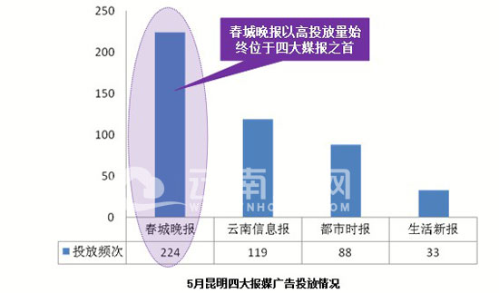 “春晚”首居:從5月昆明四大報媒投放情況來看,春城晚報的投放量始終保持領(lǐng)先位置,投放頻次為224次,占比48.28%;