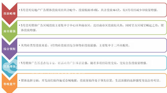 5月昆明房地產(chǎn)報媒廣告整體投放情況略有增強、中南集中、綜合物業(yè)主導(dǎo)、交房增強、春晚放量首居等特點