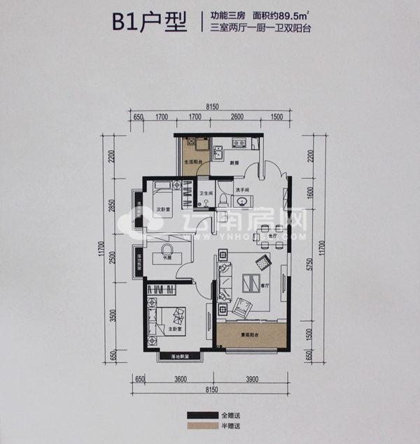 B1戶型,89.5平米三室兩廳一廚一衛(wèi)雙陽臺(tái)功能三房戶型。該戶型贈(zèng)送6平米,主臥為南向配落地凸窗,朝向較好,客廳的景觀陽臺(tái)可隨心變動(dòng),增大客廳面積,整個(gè)空間開闊,通道少,減少浪費(fèi)面積,此戶型主臥、次臥、客廳、書房、廚房、衛(wèi)生間等均有窗戶,通風(fēng)較好。不足之處:此戶型和A3戶型一樣,廚房和衛(wèi)生間、餐廳距離較近,并且開門即為衛(wèi)生間,顯得不雅,不過對(duì)于業(yè)主來說,這個(gè)戶型可以根據(jù)需求把書房改為臥室,成為緊湊型的三居室。