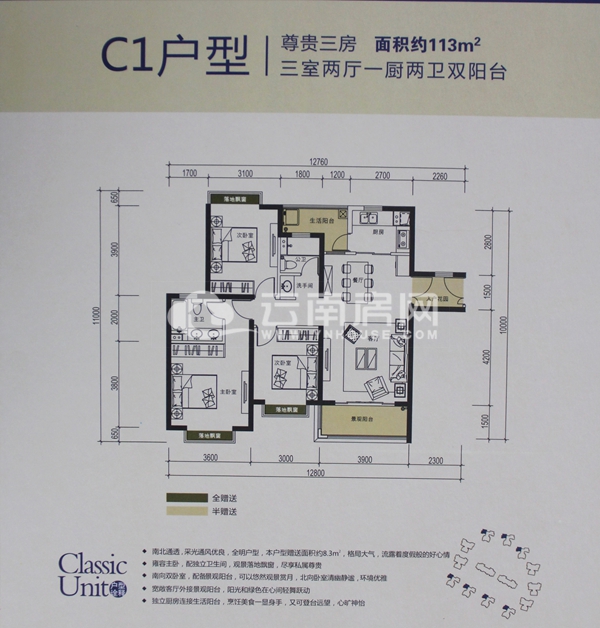 C1戶型,113平米三室兩廳一廚兩衛(wèi)雙陽臺(tái)尊貴三房戶型。該戶型贈(zèng)送8.3平米,是目前贈(zèng)送面積最大的戶型,該戶三室均為落地凸窗設(shè)計(jì),由于戶型較大,主臥還配有獨(dú)立衛(wèi)生間,充分顯示出業(yè)主的私密尊貴生活,且為南向雙臥室,北向臥室較為清幽,環(huán)境優(yōu)雅,此外,C1戶型擁有入戶花園。不足之處:此戶型雖為大戶型,但是陽臺(tái)、入戶花園、過道過于浪費(fèi)空間,且三臥室的門較為集中,容易相互影響。