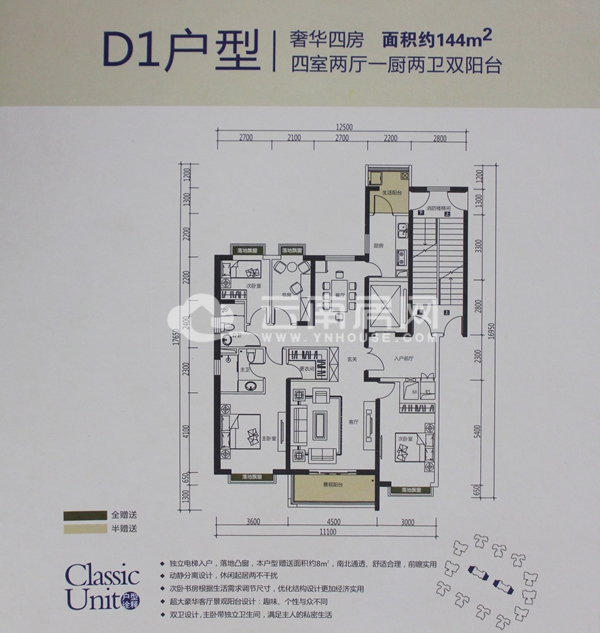 D1戶型,144平米四室兩廳一廚兩衛(wèi)雙陽臺(tái)奢華四房。該戶型贈(zèng)送8平米,為獨(dú)立電梯入戶,業(yè)主不必?fù)?dān)心電梯使用緊張,主臥獨(dú)享獨(dú)立衛(wèi)生間,更衣間,私密性較好,動(dòng)靜分離設(shè)計(jì),休閑起居兩不干擾,超大的客廳以及景觀陽臺(tái)設(shè)計(jì)使業(yè)主充享奢華生活,次臥書房可根據(jù)生活需求調(diào)節(jié),做到隨心所欲。